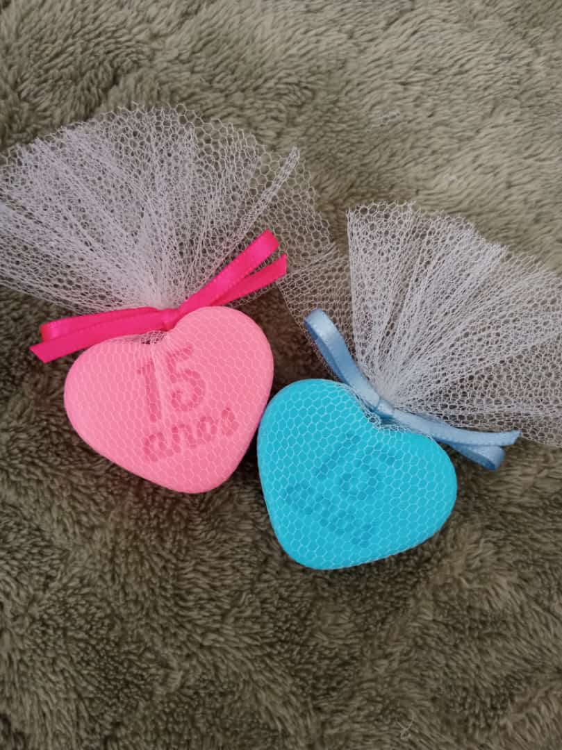 Trabalhamos com lindos sabonetes perfumados em formato de coração escrito quinze anos, feitos a mão com produtos de alta qualidade.